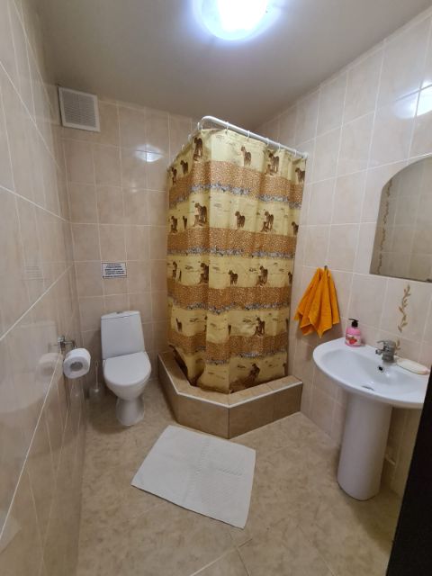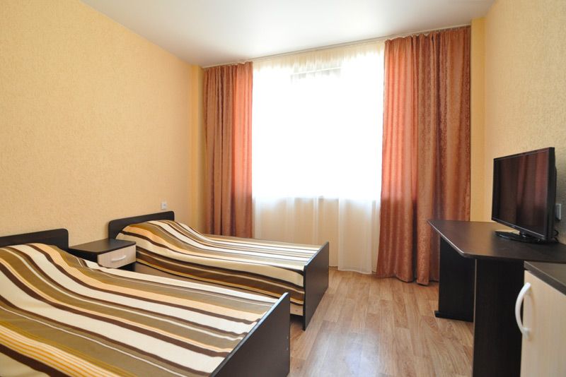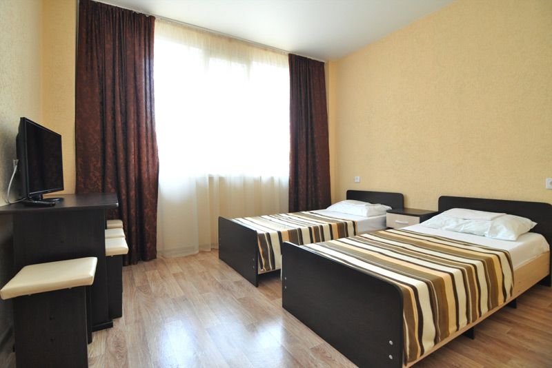 качественная мебель прекрасно сочетается с шторами и покрывалами. Во всех номерах есть телевизор, кондиционер, холодильник с небольшой морозильной камерой, санузел.