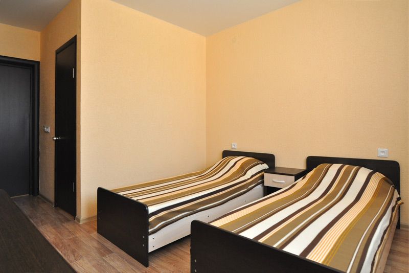 Планировка номеров включает столик и стульчики-пуфики. Ванные комнаты, оборудованы сантехникой с душевой кабиной, раковиной, на стене есть зеркало. Удобный шкаф, в нем вы найдете полотенца и набор посуды, имеется вешалка для одежды. При необходимости в номер можно установить дополнительное место.