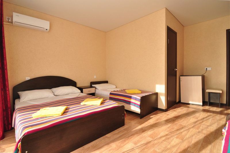 качественная мебель прекрасно сочетается с шторами и покрывалами. Во всех номерах есть телевизор, кондиционер, холодильник с небольшой морозильной камерой, санузел.